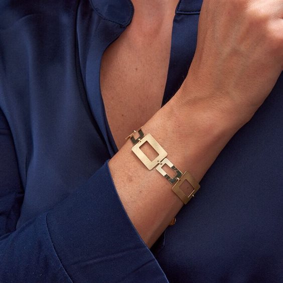 Bracciale Vintage Trendy con rettangoli Bracciale con rettangoli tagliati su foglio d'argento 925‰ placcato oro giallo 23 ct lucidati a specchio e satinati a mano e catena argento 925/000 placcatura in oro giallo 23 carati rivestimento con speciale trattamento che protegge dalla naturale ossidazione del metallo orgogliosamente fatto a mano in Italia placcature rigorosamente senza alcun rilascio di nichel e cadmio comfort fit