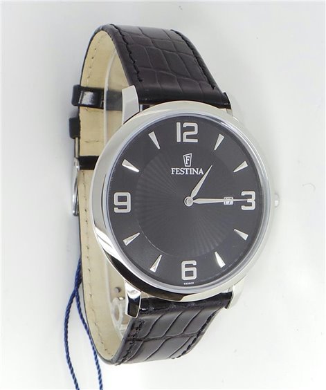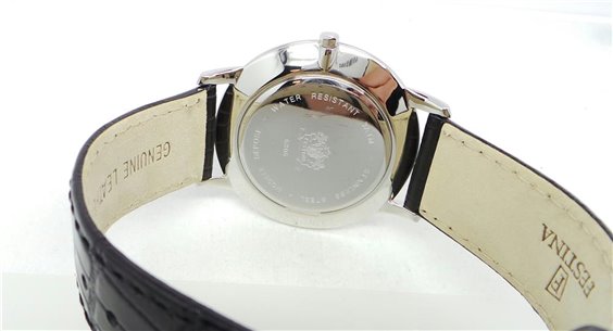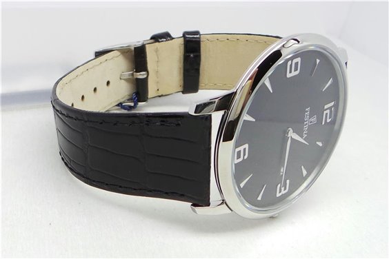 Orologio solo tempo al quarzo, water resistant 5 atm, cassa in acciaio 316L , quadrante color nero con datario alle 3, cinturino in pelle nera con stampa coccodrillo
