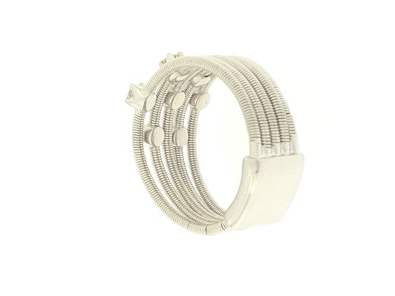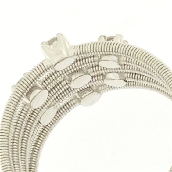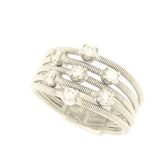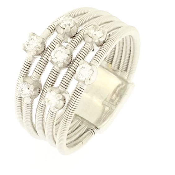 Originale anello MARCO BICEGO, della collezione Santorini,realizzato in oro bianco 18k e 7 diamanti a taglio brillante della caratura totale di o,35 punti. Colore diamanti F/G.