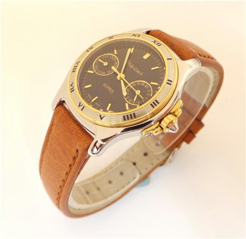 Orologio solo tempo. Cassa in acciaio inossidabile, fondello a vite lucidi, lunetta in acciaio opaco con cifre romane opache,Ø 32 mm.-spessore 9,8mm.-ansa 16mm. Movimento Swiss Made al quarzo : ore-minuti-secondi-giorno-data. Vetro zaffiro bombato. Quadrante nero lucido guilloché al centro, index e lancette dorate, contatore giorni ore 9-data ore 3. Cinturino in pelle cuoio chiaro. Impermeabile 100 metri(10 Atm). Peso 41,5 grammi. Garanzia 2 anni.