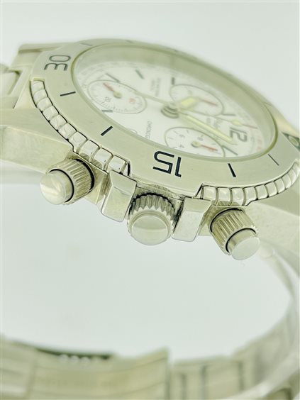 movimento cronografo al quarzo con decimi di secondo e datario. Impermeabile fino a 200 mt. Lunetta girevole unidirezionale, vetro minerale ad alta resistenza, corona a vite.