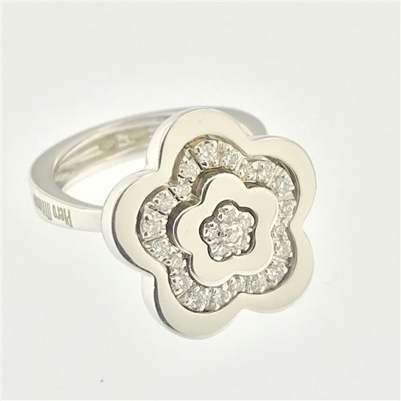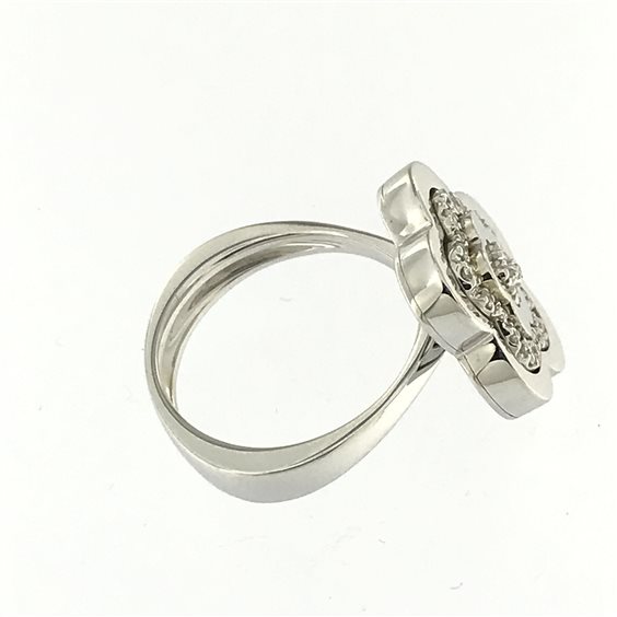 Anello di pregiata manifattura che si ispira a un fiore a cinque petali in oro bianco con diamante centrale taglio brillante e pavè di brillanti sui petali. Diametro elemento superiore 16 mm.