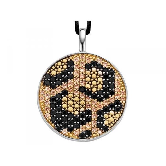 Base in argento con finitura lucida, nella parte frontale l'argento è placcato in oro giallo con particolare lavorazione silver dipped. Diametro pendente mm. 30,00 spessore mm. 2,50. Il pendente è fornito di un piccolo moschettone che permette di essere applicato a bracciale o a collana. Il pendente è completo di cordino cerato nero lungo cm. 90,00 regolabile in lunghezza con due piccoli nodi scorsoi.