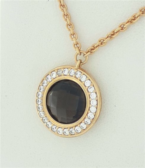 Collana in argento 925 con pendente rotondo in pietra naturale marrone e zirconi. Chiusura a moschettone e anellino per possibilità di allacciatura a cm. 42.