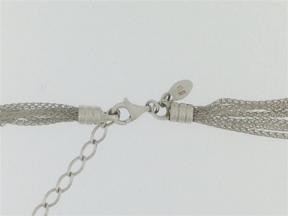 Collier in argento con catene a rete multifile e perle coltivate piena perlagione multicolor bianco, grigio, gold. Chiusura a moschettone e anelli per eventuale allungamento fino a cm. 46.